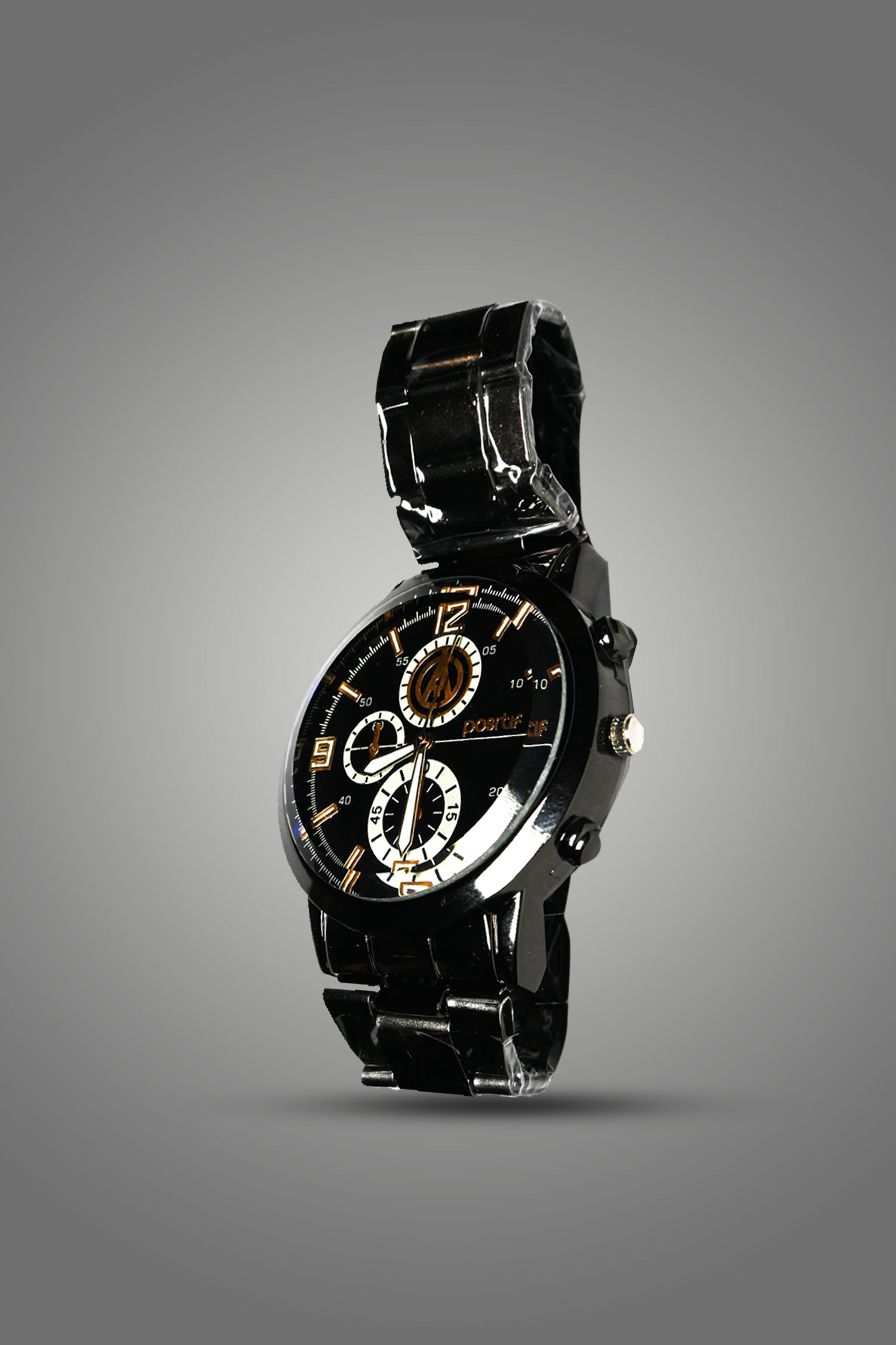 This stylish black metal wristwatch combines modern design with classic sophistication. Featuring a bold chronograph dial with detailed sub-dials, luminous markers, and a durable black metal strap, it is crafted for both elegance and functionality. Perfect for formal occasions or everyday wear, this watch is a statement accessory that complements any outfit.